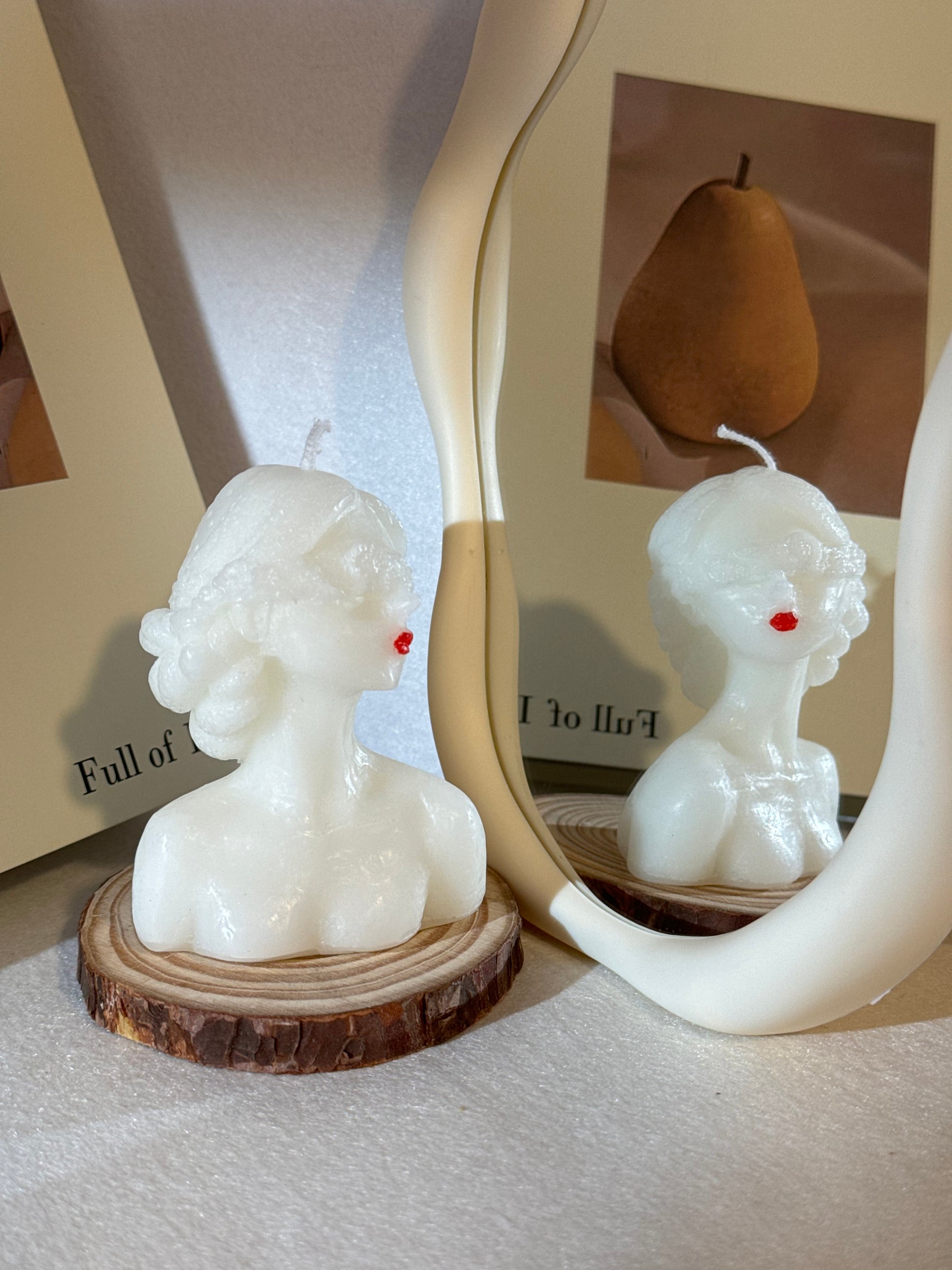 Meet Eira Muse — a hand-sculpted candle that embodies feminine serenity and timeless poise. With her delicate red lips, soft curves, and gentle blindfold, she whispers of mystery and introspection. Whether displayed as a decorative art piece or lit for a soft ambient glow, Eira Muse elevates every space she inhabits.
